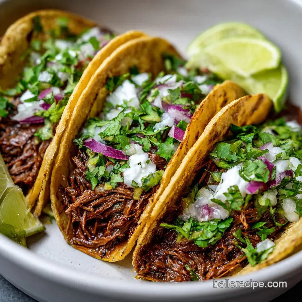 - Garnishes (Cilantro, White Onion, Lime Wedges): Why this? Freshness is the necessary contrast to the heavy, slow cooked beef.
